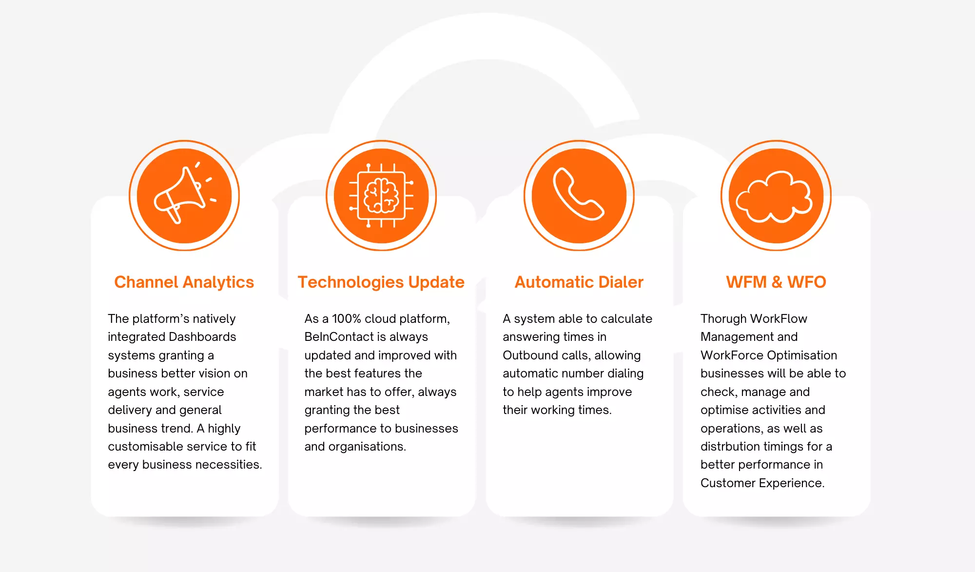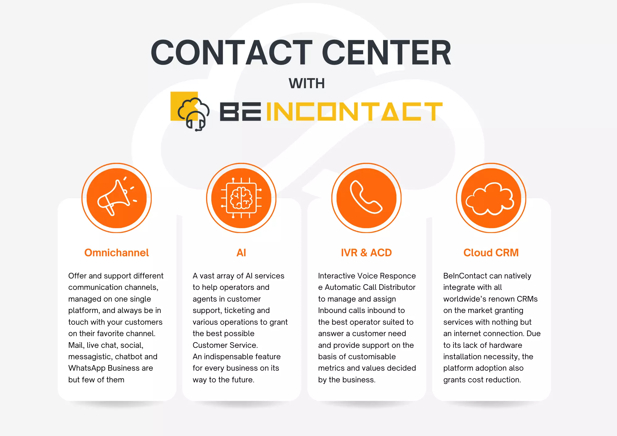 Our newest 100% Cloud Omnichannel solution, BeInContact, helps manage all business contact channels with simplicity and effectiveness. The platform revolutionizes customer connection and Contact Centers, offering simultaneous interactions on different communication channels.